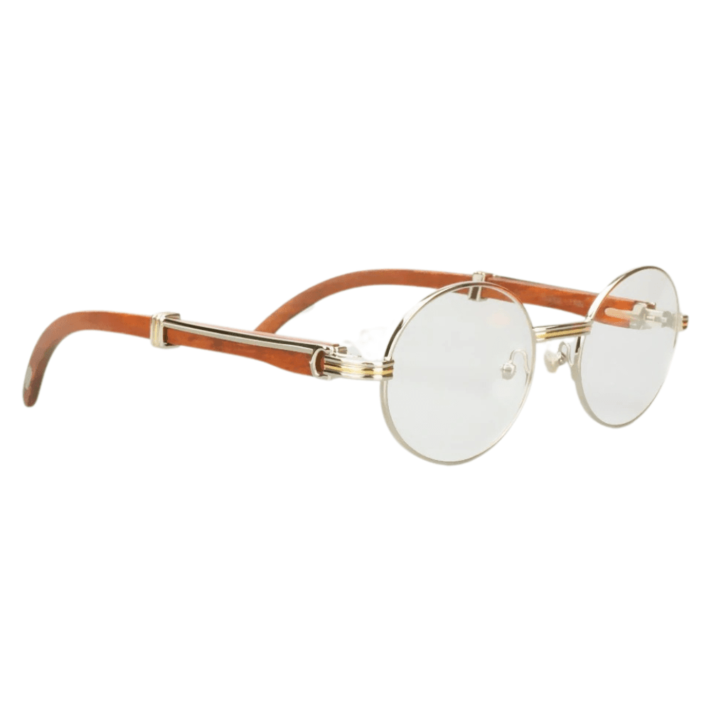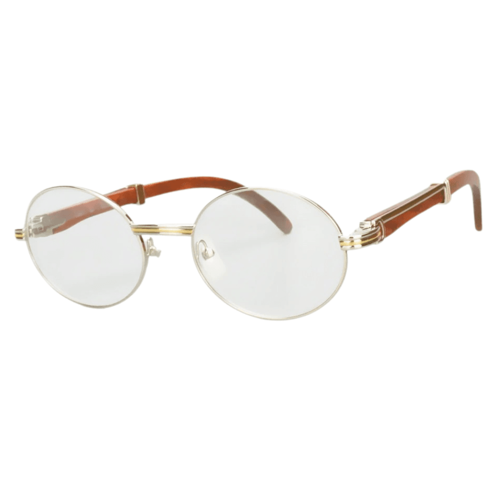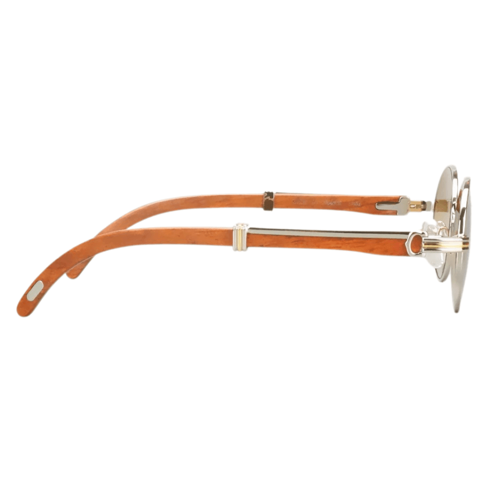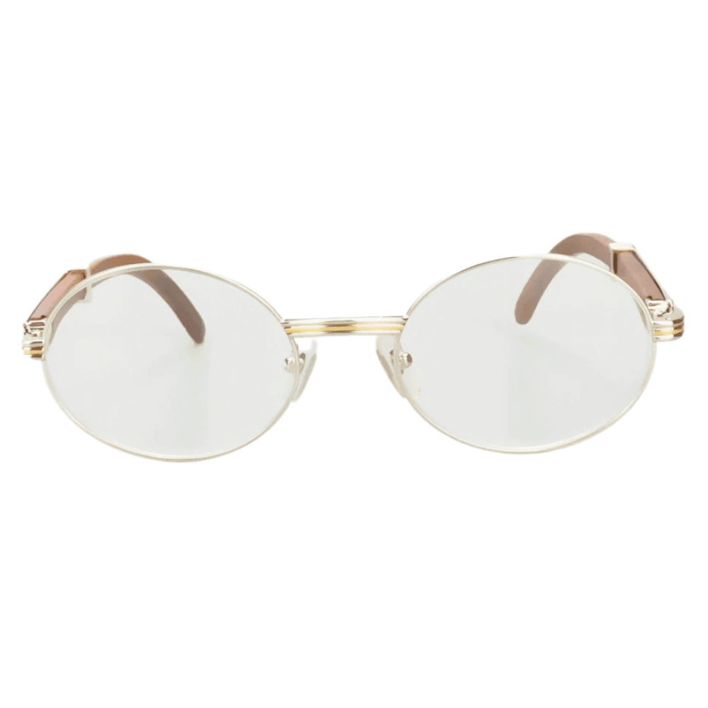 Elevate your eyewear collection with the Vintage Cartier Silver Giverny Eyeglasses. Merging classic design with modern functionality, these oval-shaped frames feature a sophisticated gold frame color that complements any ensemble. The unisex design makes them a versatile addition to any wardrobe.Crafted with a unique blend of metal and wood, these frames ensure durability while maintaining a lightweight feel. The clear polycarbonate lenses provide impeccable vision clarity and are designed to withstand the rigors of daily wear. Embrace the luxury and timeless style synonymous with Cartier, whether you’re dressing up for a special occasion or accenting your everyday look.
